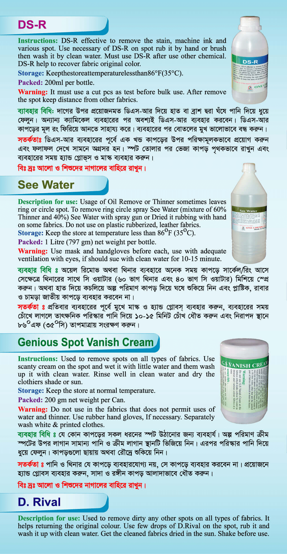 1. গার্মেন্টস এর সকল প্রকার ফেব্রিক্স হতে দাগ অপসারণ করার কেমিক্যাল সরবরাহ ও বিক্রয় করে থাকি যেমন জং, মরিচা, ডার্টি স্পট, তৈল জাতীয় দাগ, হলুদের দাগ,মেশিনের কালি, ওয়াশের পরে স্পট, কলমের কালি, হিটসেল প্রিন্ট, রাবার প্রিন্ট, স্কিন প্রিন্ট, গামের স্পট, পোকার দাগ, রং জাতীয় স্পট ইত্যাদি দাগ অপসারণ করার কেমিক্যাল সহজে পাওয়া যায়।